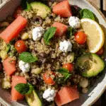 - Salade pastèque & feta : cubes de pastèque, feta émiettée, menthe, huile d’olive.