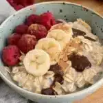 Mélangez les flocons d’avoine avec le lait et l’eau. Mettez au micro-ondes pendant 1 minute, puis mélangez et faites chauffer à nouveau pendant 30 secondes à 1 minute (à surveiller). Ajoutez vos toppings et dégustez!