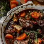 Un plat réconfortant à base de bœuf mijoté lentement dans du vin rouge, idéal pour les soirées froides.