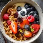 Pas de yaourt grec sous la main ? Pas de souci ! Tu peux utiliser du yaourt nature, ou même du lait d’amande si tu as besoin d’une option vegan. Les graines de chia peuvent être remplacées par du lin, mais soyons honnêtes, c’est moins trendy. Pour les fruits, tout est permis, même une banane ou des pommes — tant que ça reste bon, on est okay. Et si tu veux tout dehors, des noix hachées, c’est aussi très bien.