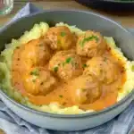 Des boulettes de viande juteuses dans une sauce crémeuse, servies avec une purée de pommes de terre lisse pour un repas réconfortant en famille.