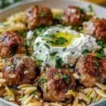 Servez les boulettes sur un lit d’orzo, arrosées de la crème de feta pour une présentation appétissante. Ce plat se marie bien avec une salade verte pour un repas équilibré.