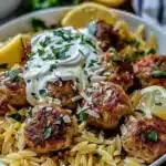 Un plat délicieux et réconfortant de boulettes savoureuses et orzo citronné, accompagné d’une onctueuse crème de feta.