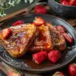 Pour servir le Brioche Perdue, placez les tranches dorées sur une assiette et ajoutez une belle portion de fraises fraîches sur le dessus. Vous pouvez aussi saupoudrer un peu de sucre glace pour une touche esthétique. Ce plat est meilleur lorsque servi chaud, accompagné d’un café ou d’un thé.