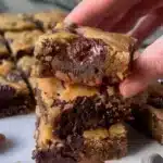 Assemblage : Étalez un peu plus de la moitié de la pâte de brownie (vous pouvez vous baser sur les yeux) au fond de votre moule de 9×13. Déposez la feuille de pâte à biscuits par-dessus cela, en retirant le morceau de papier sulfurisé supplémentaire. Étalez le reste de la pâte à brownies sur le dessus. Formez des disques épais avec le reste de la pâte à biscuits et placez-les sur le dessus de la pâte. (Voyez les photos dans le billet de blog ci-dessus si vous avez besoin d’aide pour visualiser cela !) Enfoncez des pépites de chocolat supplémentaires dans les endroits nus de la pâte à biscuits, si désiré.