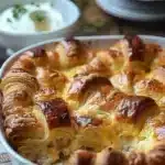 Une délicieuse casserole de croissants avec des œufs crémeux et du fromage, parfaite pour un brunch en famille.