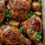 Un plat réconfortant de poulet juteux et de pommes de terre dorées, préparé en une seule fois pour une simplicité délicieuse.