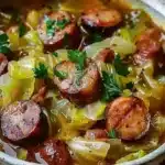 Un plat réconfortant de chou vert braisé avec des saucisses fumées, parfait pour les soirées fraîches.
