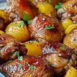 Un plat réconfortant de cuisses de poulet dorées accompagné de pommes de terre rustiques rôties, parfait pour les dîners en famille.