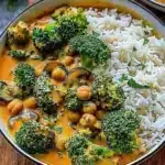 Un curry végétarien savoureux au brocoli et pois chiches, riche en saveurs et en nutriments, parfait pour un dîner rapide.