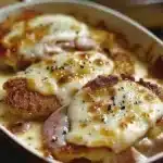 - Montage du plat : Placez les escalopes dans un plat allant au four, ajoutez une tranche de jambon sur chaque escalope, puis recouvrez de tranches de reblochon.