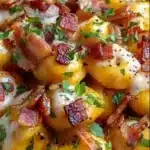 - Servez les gnocchis garnis de bacon émietté et de persil haché, avec du parmesan supplémentaire si souhaité.