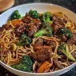 Un plat délicieux de nouilles sautées au bœuf, parfait pour un dîner rapide, avec une sauce sucrée-salée.