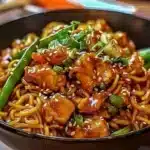 Délicieuses nouilles sautées au poulet caramélisé, rapides à préparer, alliant saveurs sucrées et salées avec des légumes croquants.