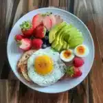 Servez votre Petit Déjeuner Santé sur une belle assiette. Disposez les tranches de pain avec l’avocat et les œufs au centre. Ajoutez quelques tranches de jambon à côté et garnissez le tout avec des fruits frais. C’est joli et appétissant !