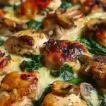 Un plat réconfortant de poulet savoureux, cuit au four avec des épinards frais et des champignons, parfait pour un dîner léger et délicieux.