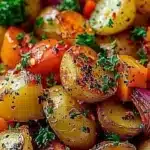Un plat réconfortant de pommes de terre et légumes rôtis à l’ail et aux herbes, parfait en accompagnement ou en plat principal.
