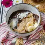 Servez le porridge bien chaud, garni de rondelles de banane, de noix de coco râpée et de chocolat noir si vous le souhaitez. Vous pouvez l’accompagner d’un café ou d’un thé selon vos préférences.