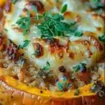 - Remplissez les moitiés de potimarron avec le mélange de quinoa. Soyez généreux, car c’est là que toute la saveur s’accumule.