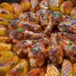 - Dans un grand plat, disposez les cuisses de poulet et les morceaux de pommes de terre.