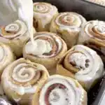 - À la sortie du four, laissez refroidir légèrement, puis nappez les roulés de glaçage à la crème épaisse.