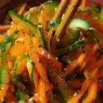 - Mélangez vos légumes: Dans un grand bol, combinez les tranches de concombre et les carottes râpées. Le mélange des couleurs vives vertes et oranges est déjà un régal pour les yeux.