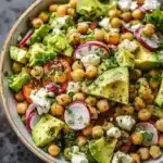 Une salade saine et colorée avec des pois chiches, de la feta et de l’avocat, parfaite pour un repas léger.