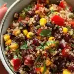 Une salade colorée de quinoa, haricots et légumes, parfaite pour un déjeuner léger ou un accompagnement.