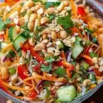 Servez la Salade Thaï Cacahuète dans un grand plat ou des assiettes individuelles. Cela met en valeur les couleurs des légumes et attire les invités. Garnissez de quelques herbes supplémentaires pour une touche de fraîcheur.