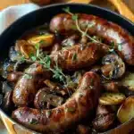 Une recette simple et savoureuse de saucisses, champignons et pommes de terre rôties, parfaite pour les repas en famille ou entre amis.