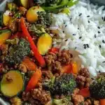 Un plat réconfortant et rapide, riche en saveurs, combinant du bœuf haché épicé et des légumes croquants sur un lit de riz vapeur.
