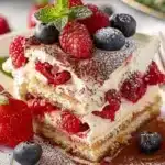 Let me just say this: it is idiot-proof, even I didn’t mess it up and trust me, that is saying something. This Tiramisu has all the richness of the classic version but with a fruity twist that makes it perfect for summer picnics or cozy winter nights—just change the fruit like the weather and you’re good to go. You get creamy, dreamy layers of mascarpone combined with the sweet zing of red berries. And the best part? No baking required. Seriously. You just layer, chill, and devour.